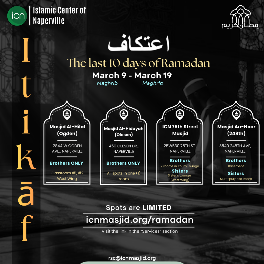 Please note: FOR SISTERS, Iʿtikāf arrangements will be made ONLY at the ICN 75th Street masjid & Masjid An-Noor (The facilities for showers will NOT be available at these locations. Sisters are requested to please make alternative arrangements).